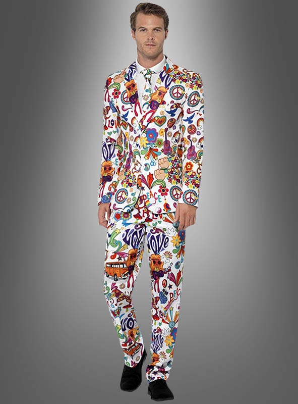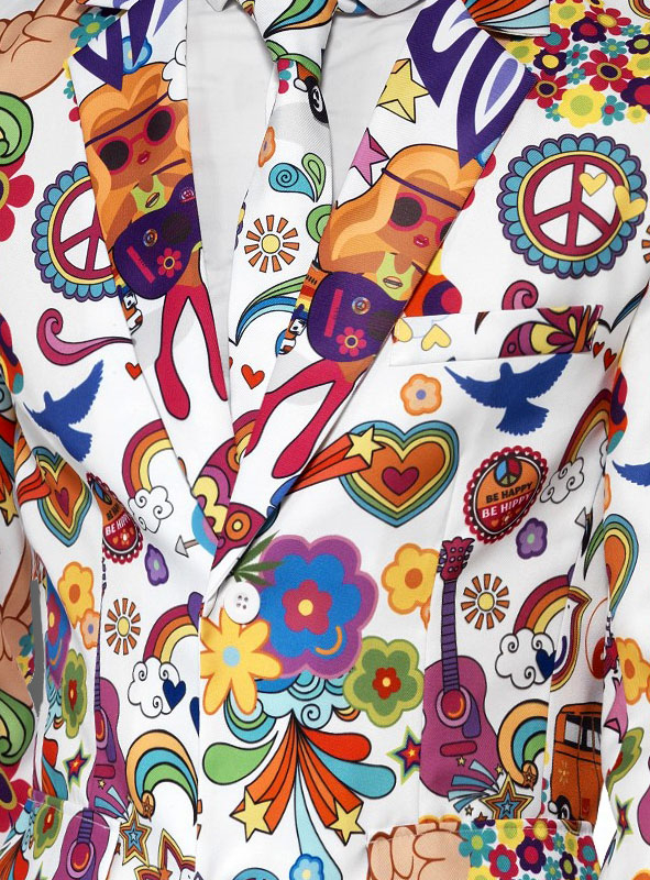 Der bunte Herrenanzug hat einen geraden, figurbetonten Schnitt und ist mit vielen verschiedenen Hippie Motiven bedruckt wie Peace-Zeichen, Blumen, Herzen, Bussen und Tauben.