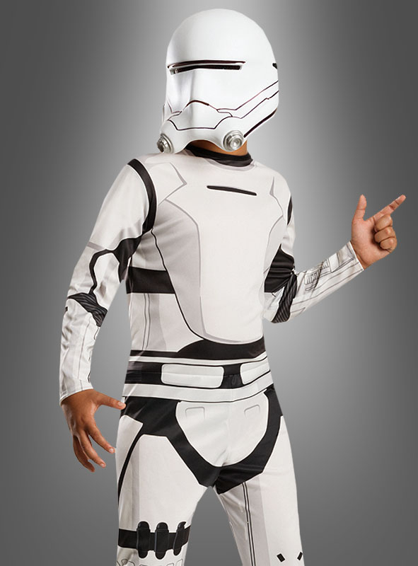 Das Star Wars Kinderkostüm besteht aus einem weißen Overall mit aufgedrucken Rüstungsteilen. Leicht gepolsterte Schuhüberzieher sind an dem Beinen unten angenäht. Sie werden über die eigenen Schuhe gestülpt und sehen dann toll wie Stiefel der Trooper aus. Am Rücken wird der Overall mit Klett verschlossen.